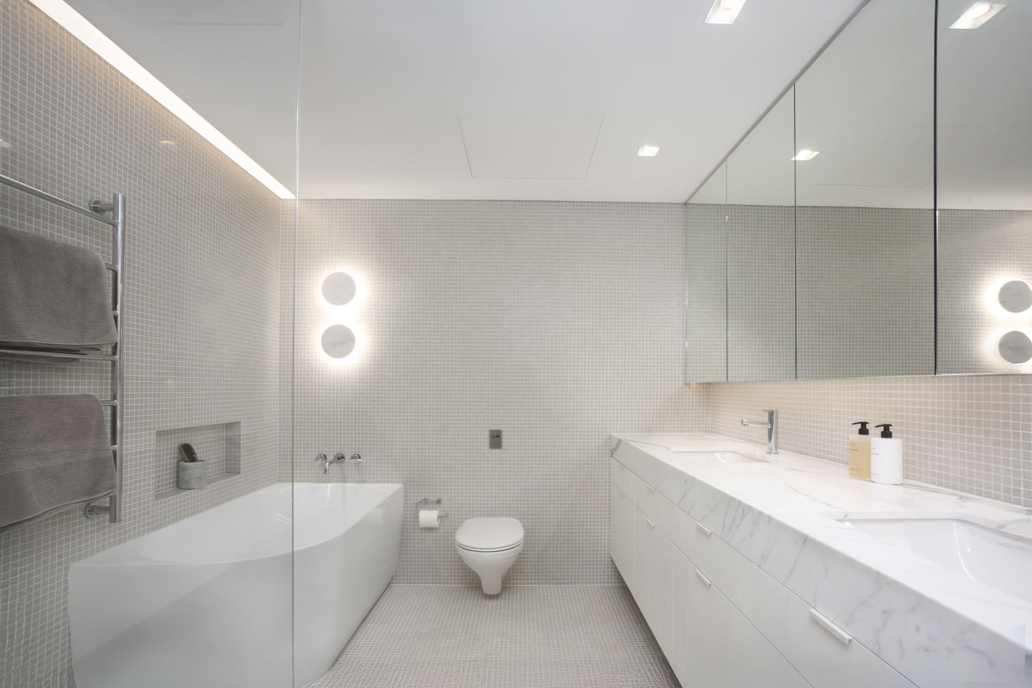 New master bathroom with glass mosaic tiles including a custom-made vanity with wire brushed oak cabinetry spanning the length of the bathroom and undermounted basins coupled with featured Calcutta Statuario Marble. Hidden LED strip lighting and hidden finger pulls finished off the sleek design. Ambient lighting including two complimentary white marble wall sconces and a cleverly concealed aluminium extrusion containing LED lighting and the bathroom exhaust system only enhance the sleek modern look while not compromising on light or ventilation.